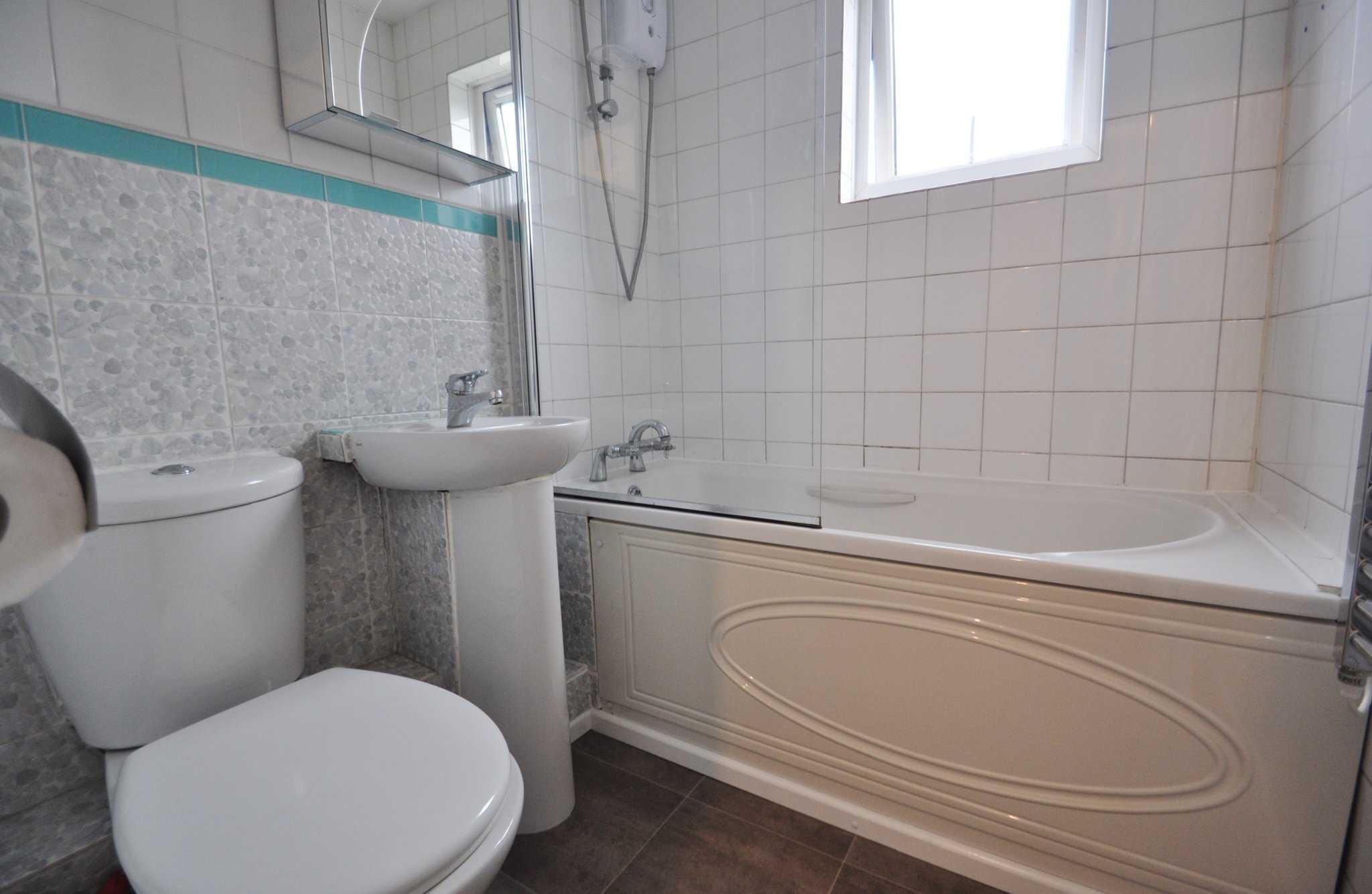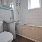 White suite comprising panelled bath with shower over, wash hand basin and low flush w.c. Fully tiled, obscure double glazed window to side.