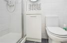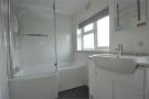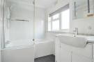 Shower end bath with shower screen and overhead shower. Tiling to walls. Wash hand basin with cupboards beneath. Low flush w.c. Extractor fan. Two windows to rear. Heated towel rail.