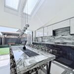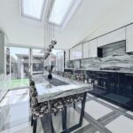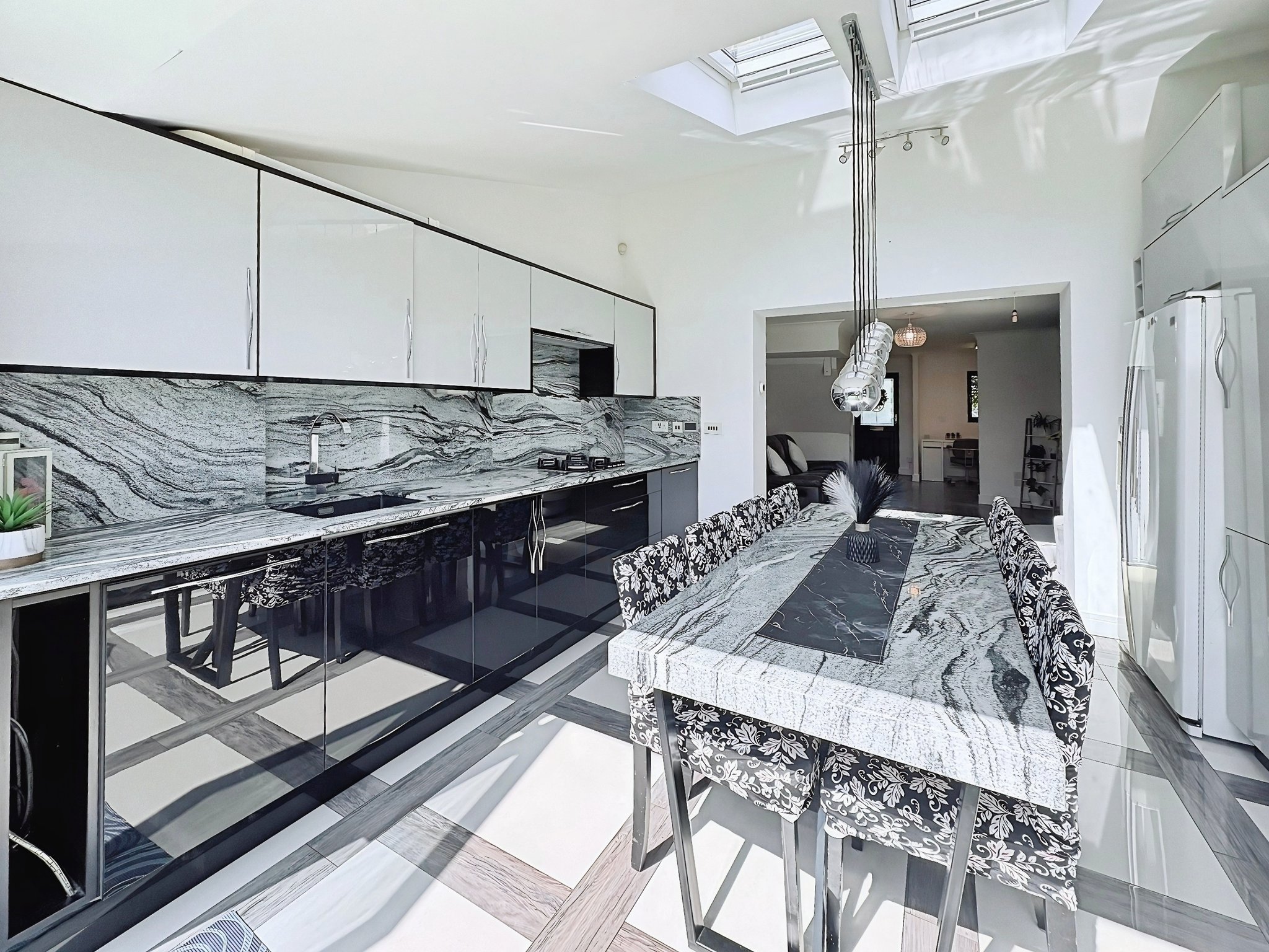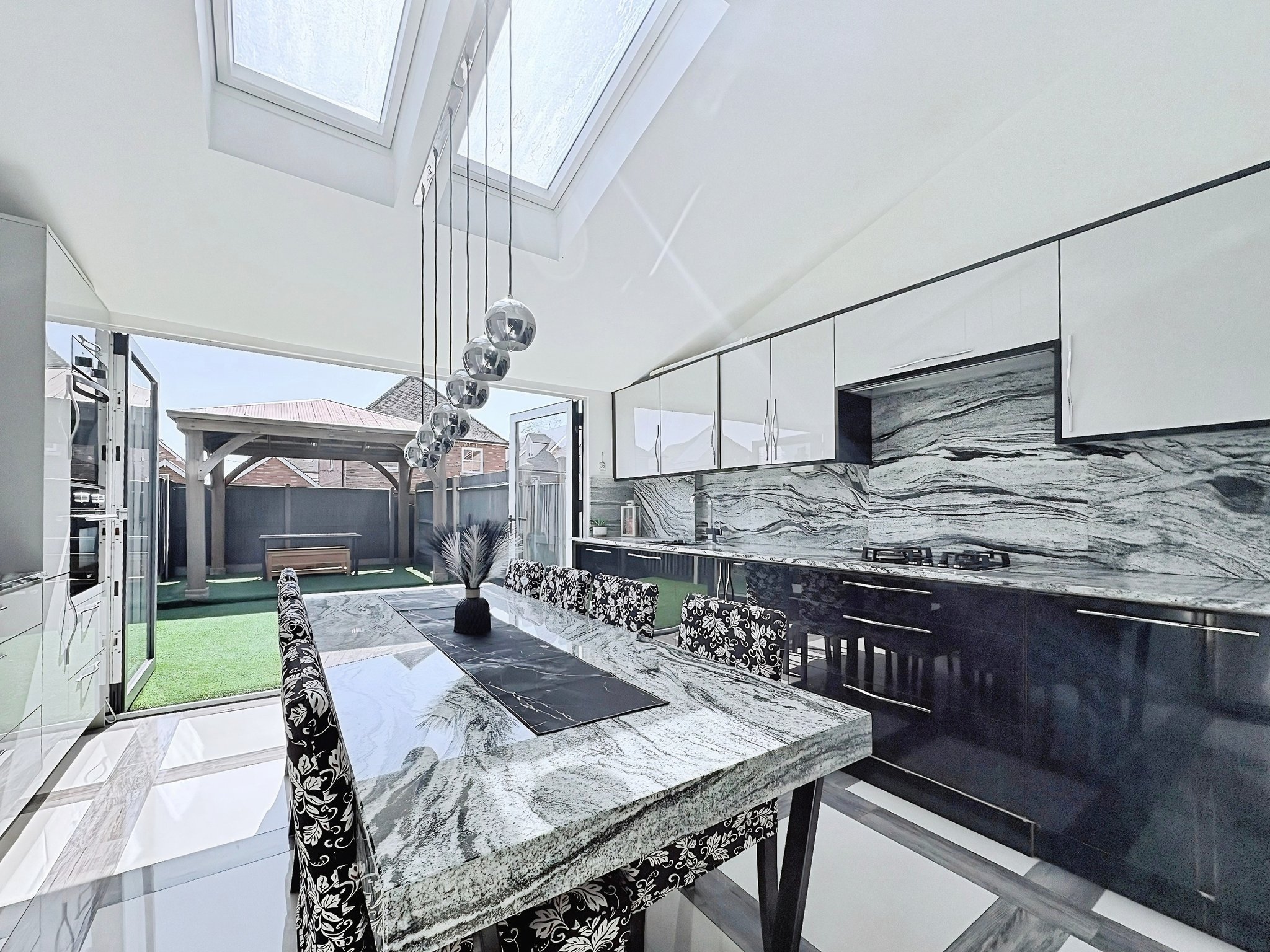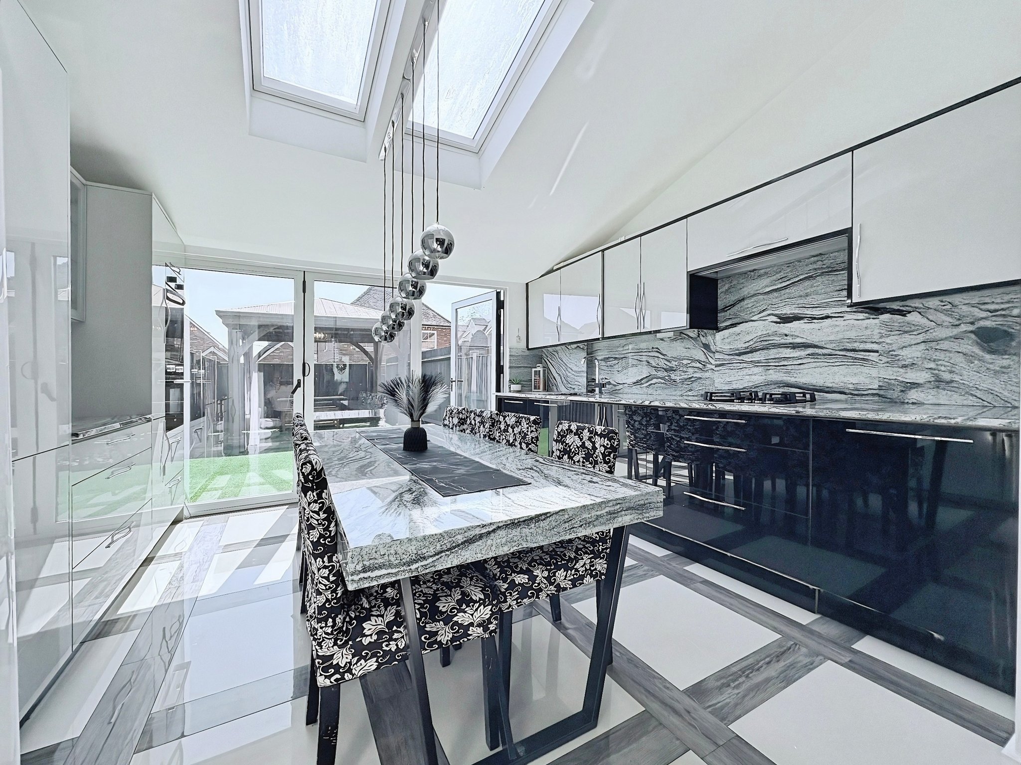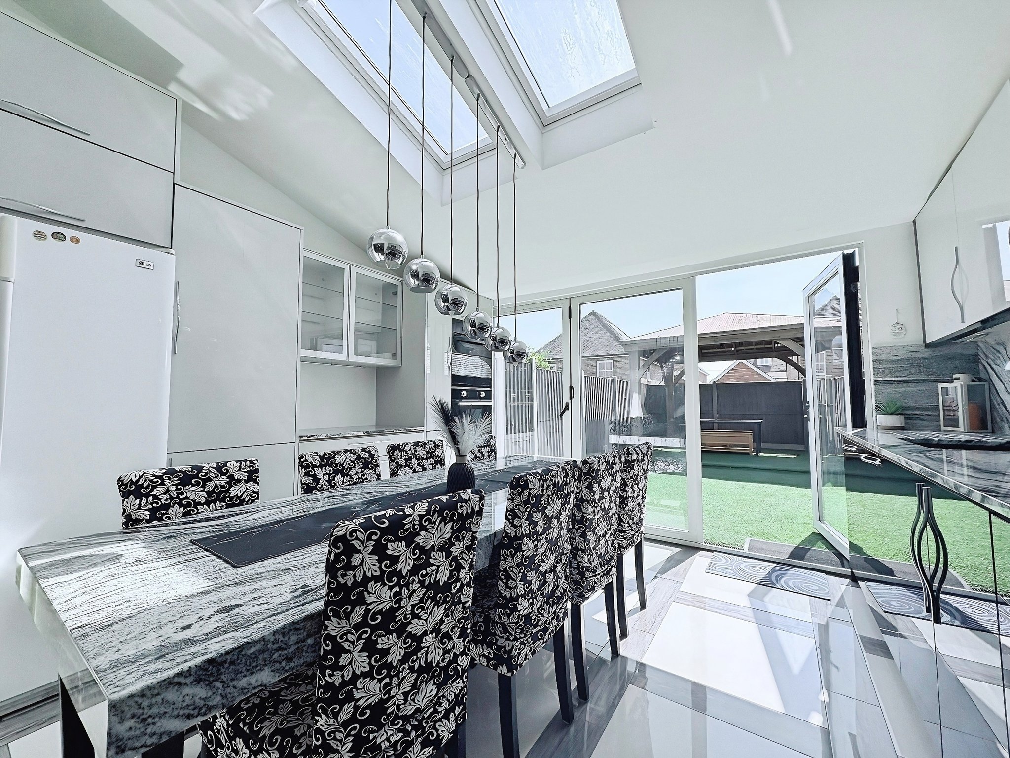 13' 4" x 8' 2" (4.06m x 2.49m) Double glazed bi-folding doors to the garden, two skylight windows, kitchen has been fitted with a range of eye level and base units with granite worktops and splashbacks, sink with mixer tap, electric oven and gas hob and extractor over, American fridge freezer, integrated dishwasher, bespoke dining table made for the kitchen from Granite.