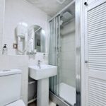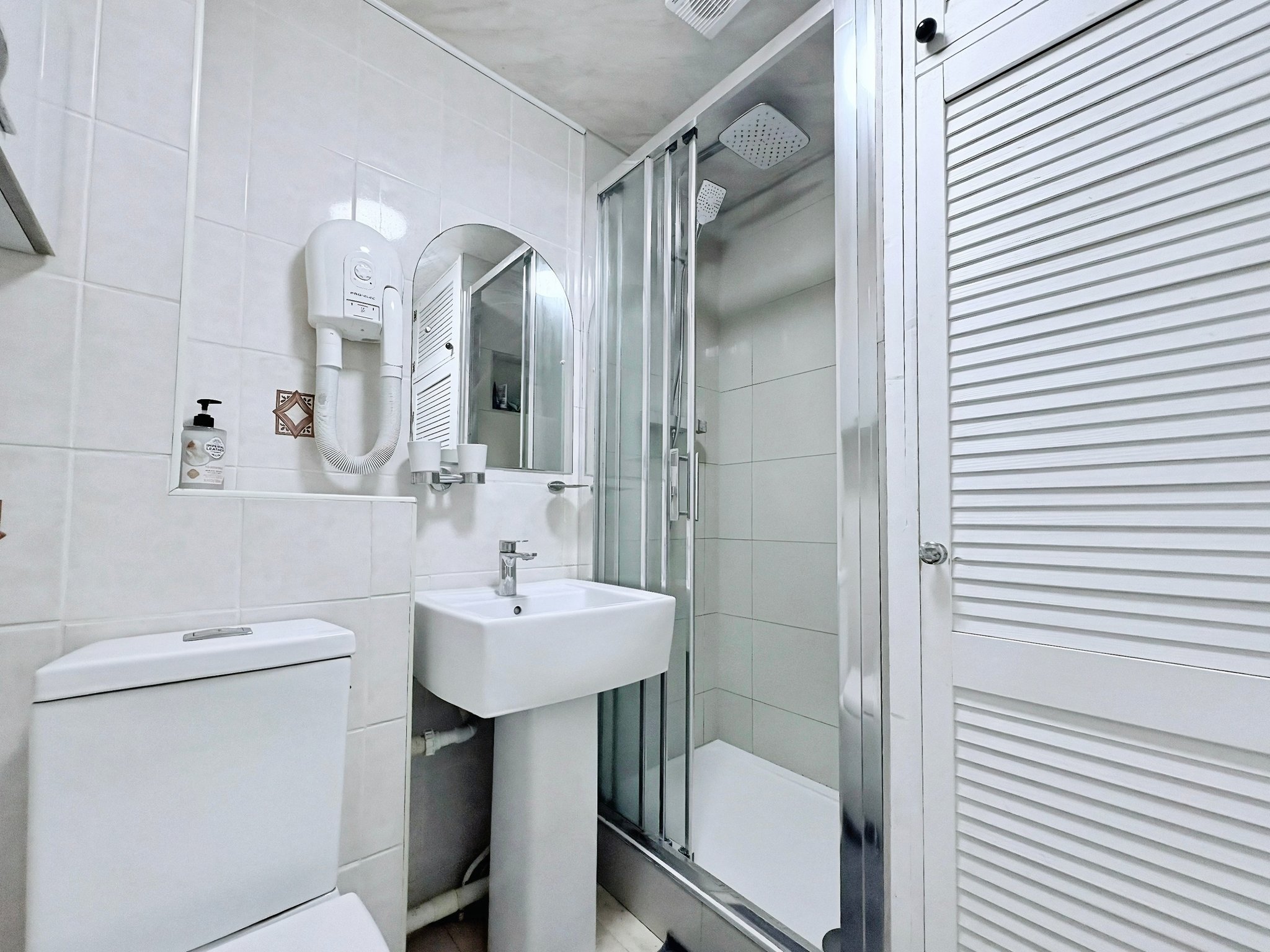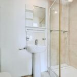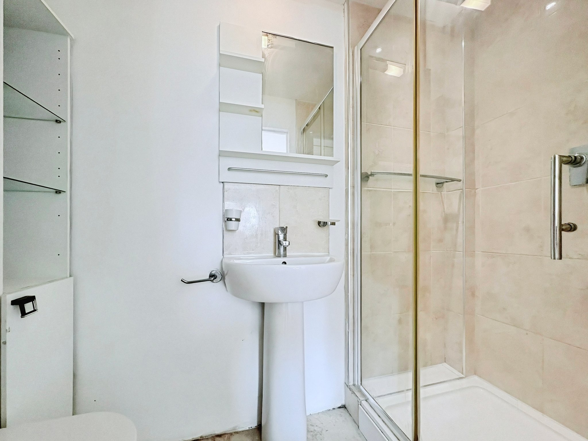 Low level WC, wash hand basin, shower cubicle, heated towel rail.