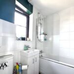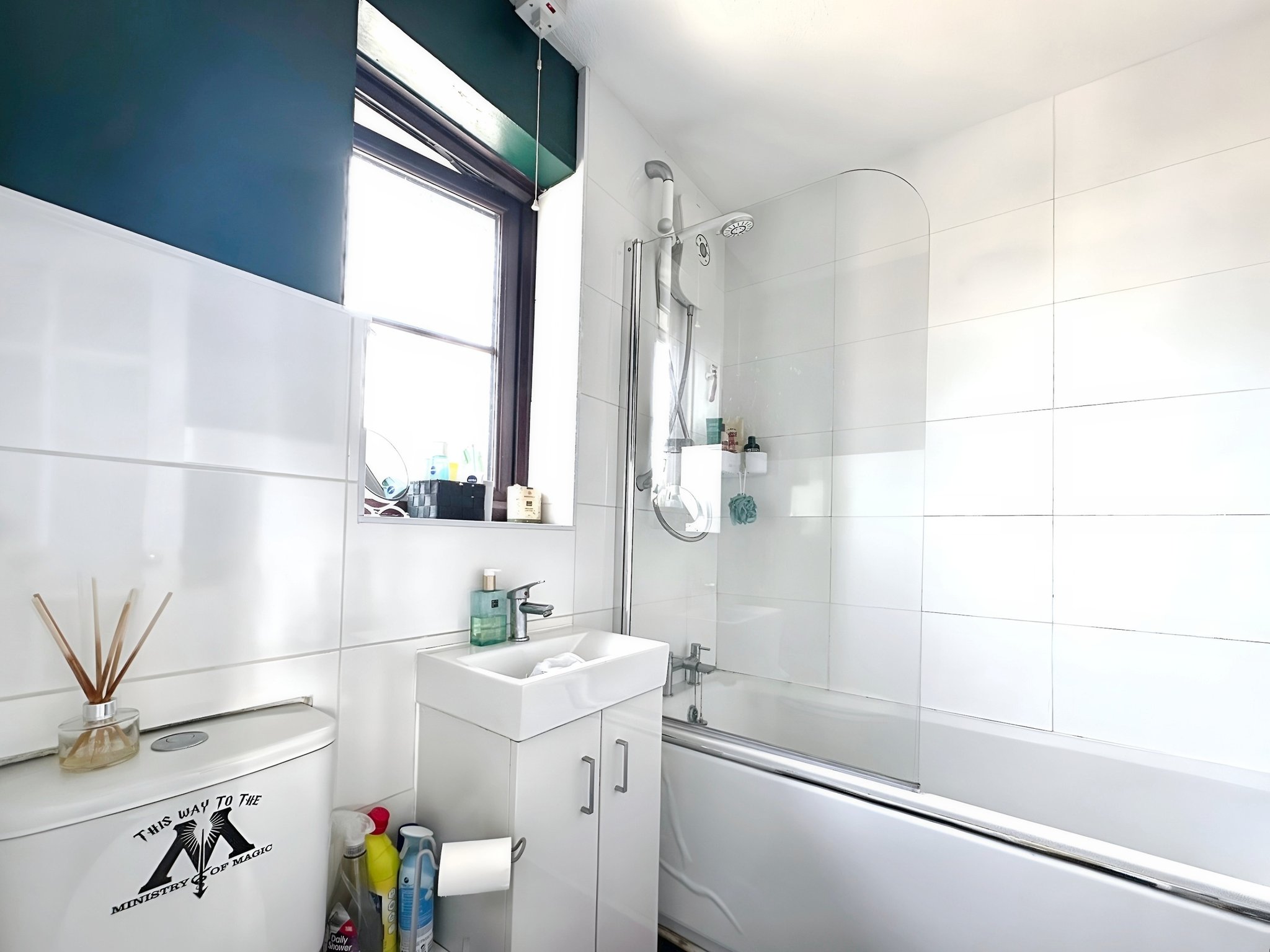 White suite comprising ; panel enclosed bath , overhead shower and screen, tiling to walls, wash hand basin with vanity cupboard beneath, low flush w.c, sealed unit window to rear, tiled flooring, electric heating.