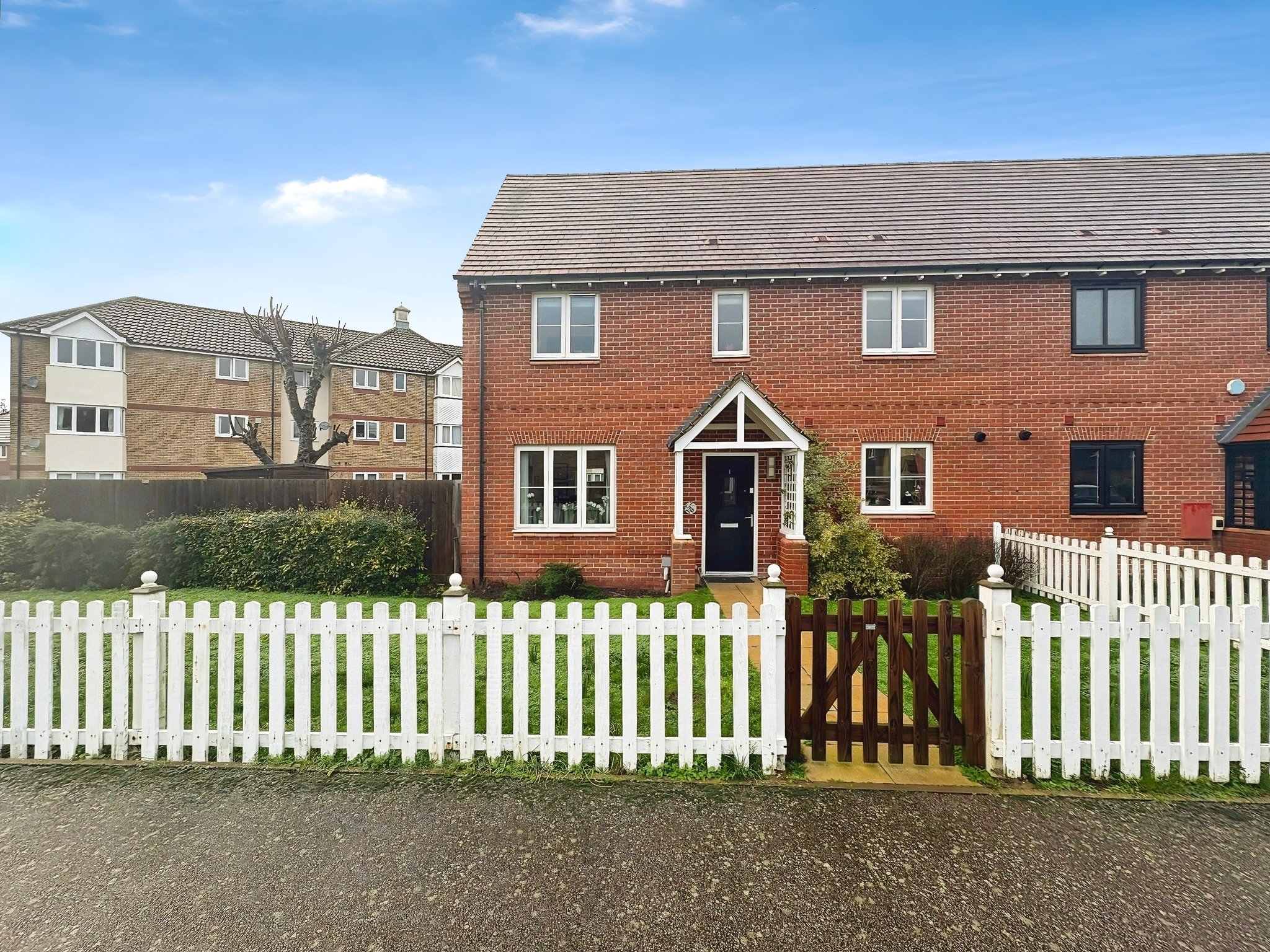 Picket fence with gate, laid to lawn, pathway to house.
