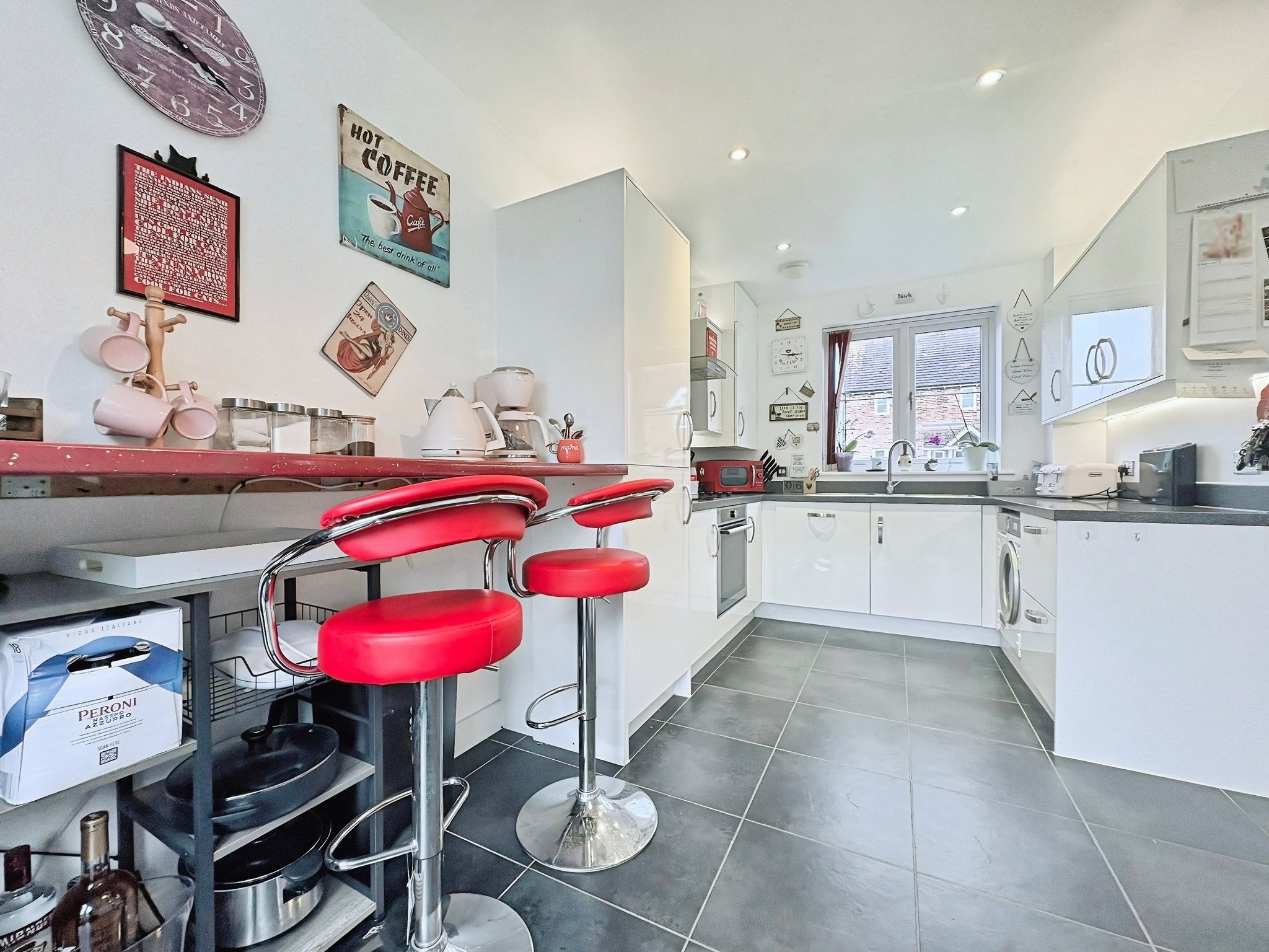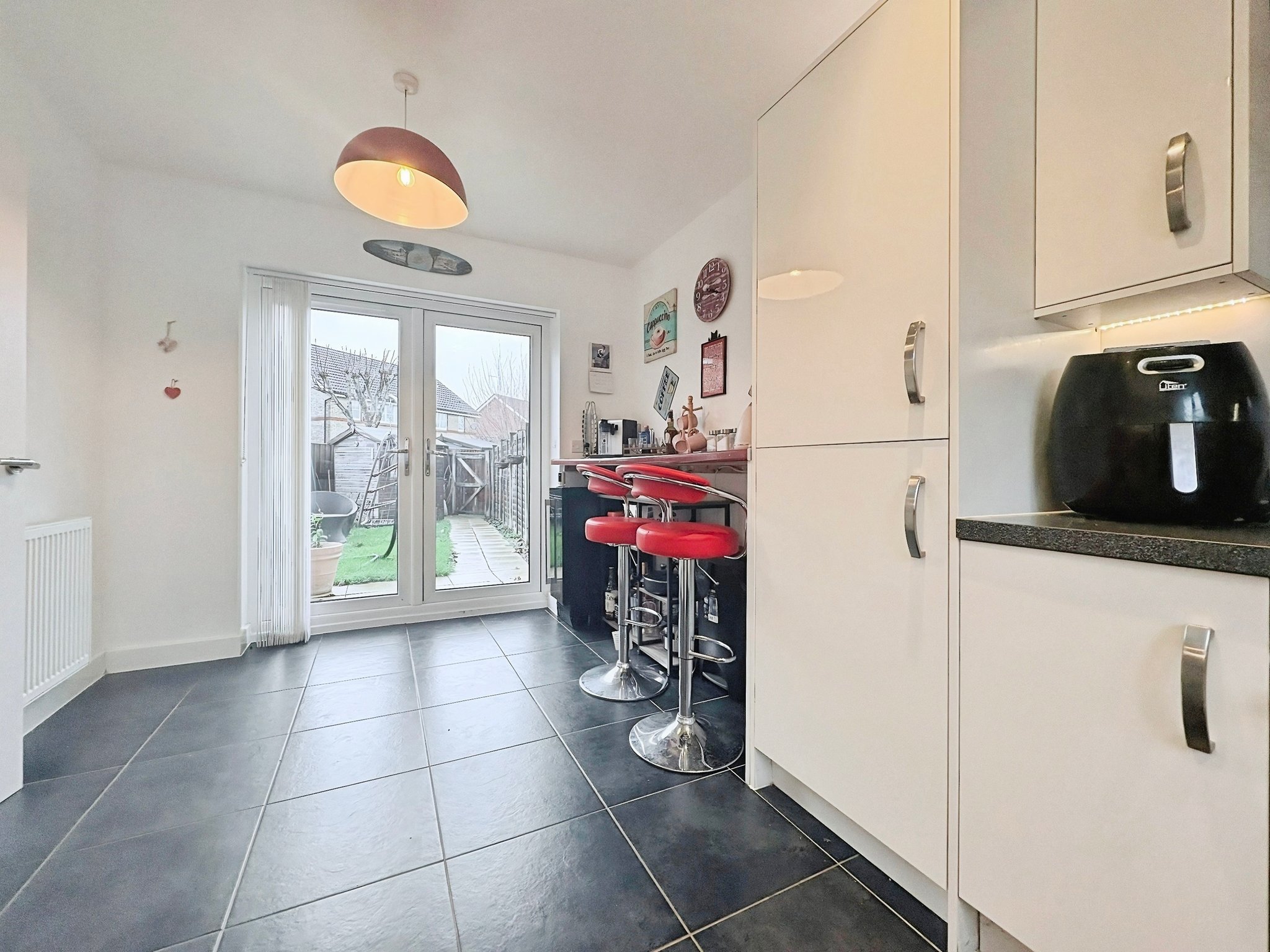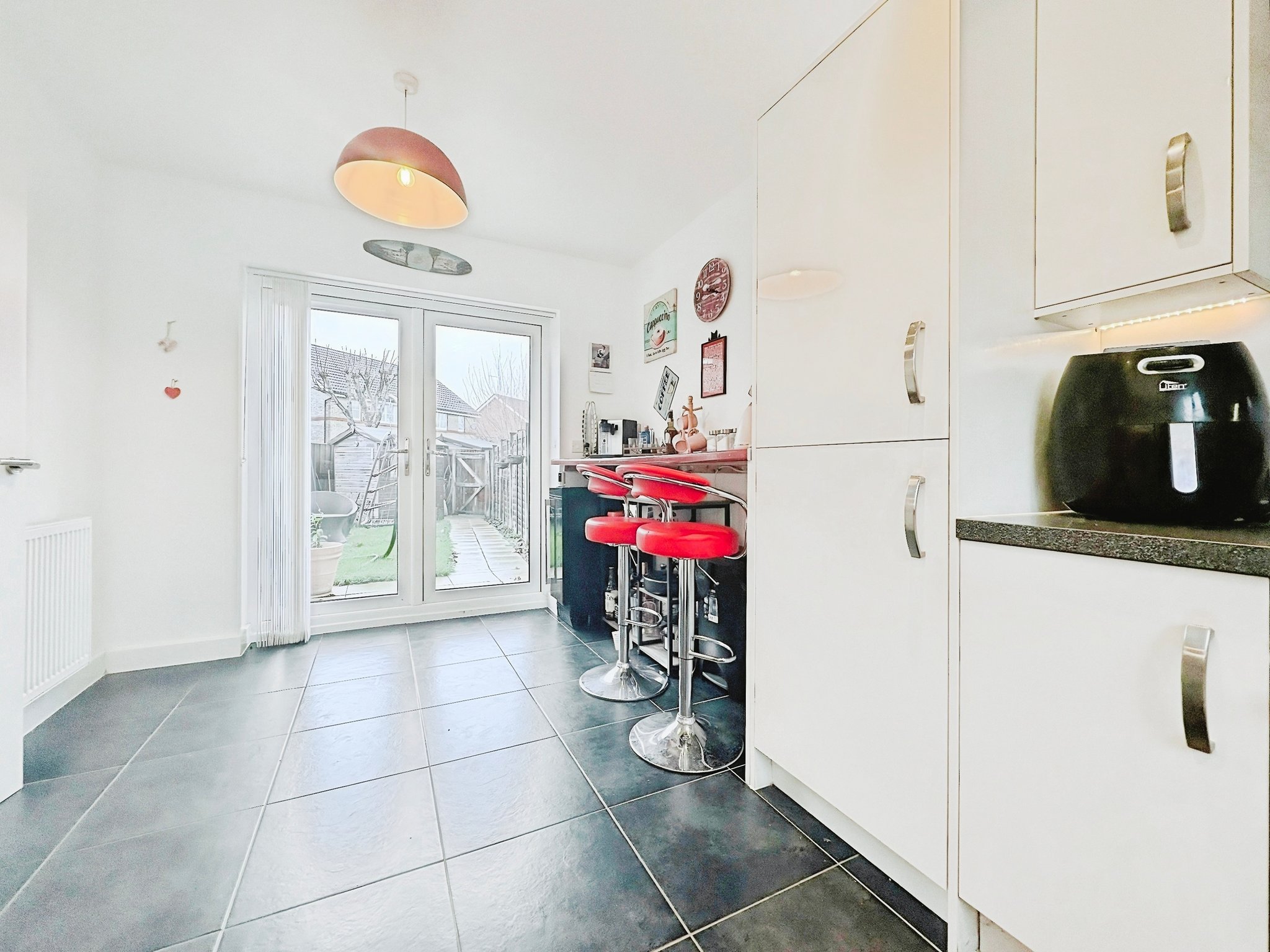 9' 03" x 15' 04" (2.82m x 4.67m) Double glazed window to the front and French door to the rear garden, matching wall and base level units, integrated oven and hob, dishwasher, fridge freezer, washer/dryer, Amtico flooring,