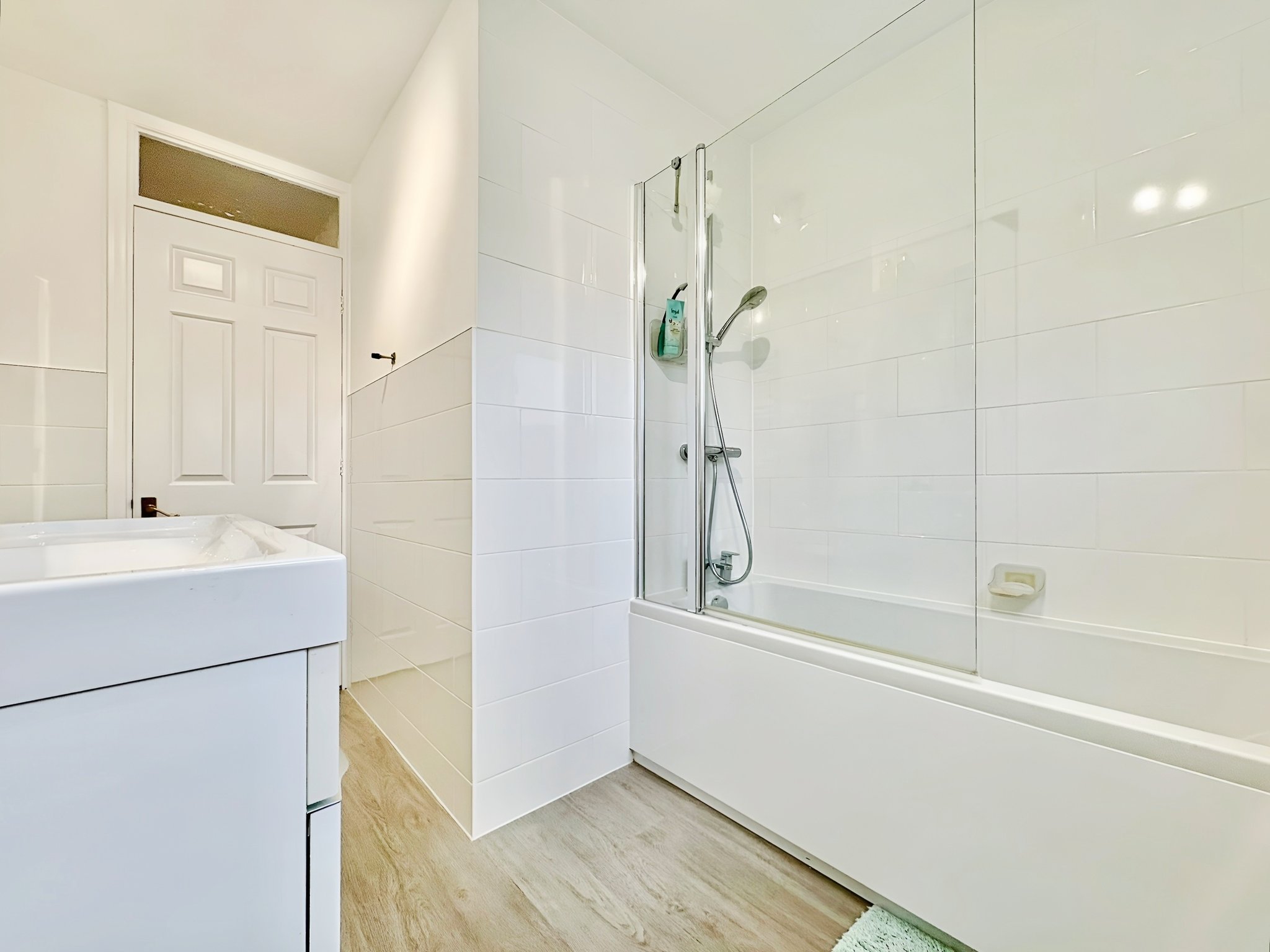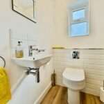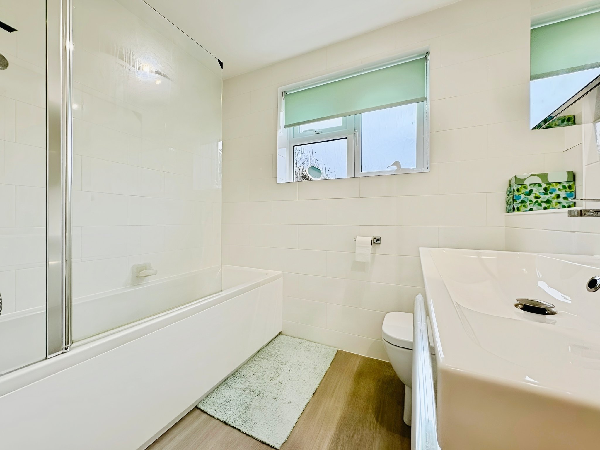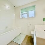 Obscure double glazed window to front, newly fitted bathroom, panel bath with shower mixer tap, low level W/C, pedestal hand wash basin, heated towel rail, tiled walls.