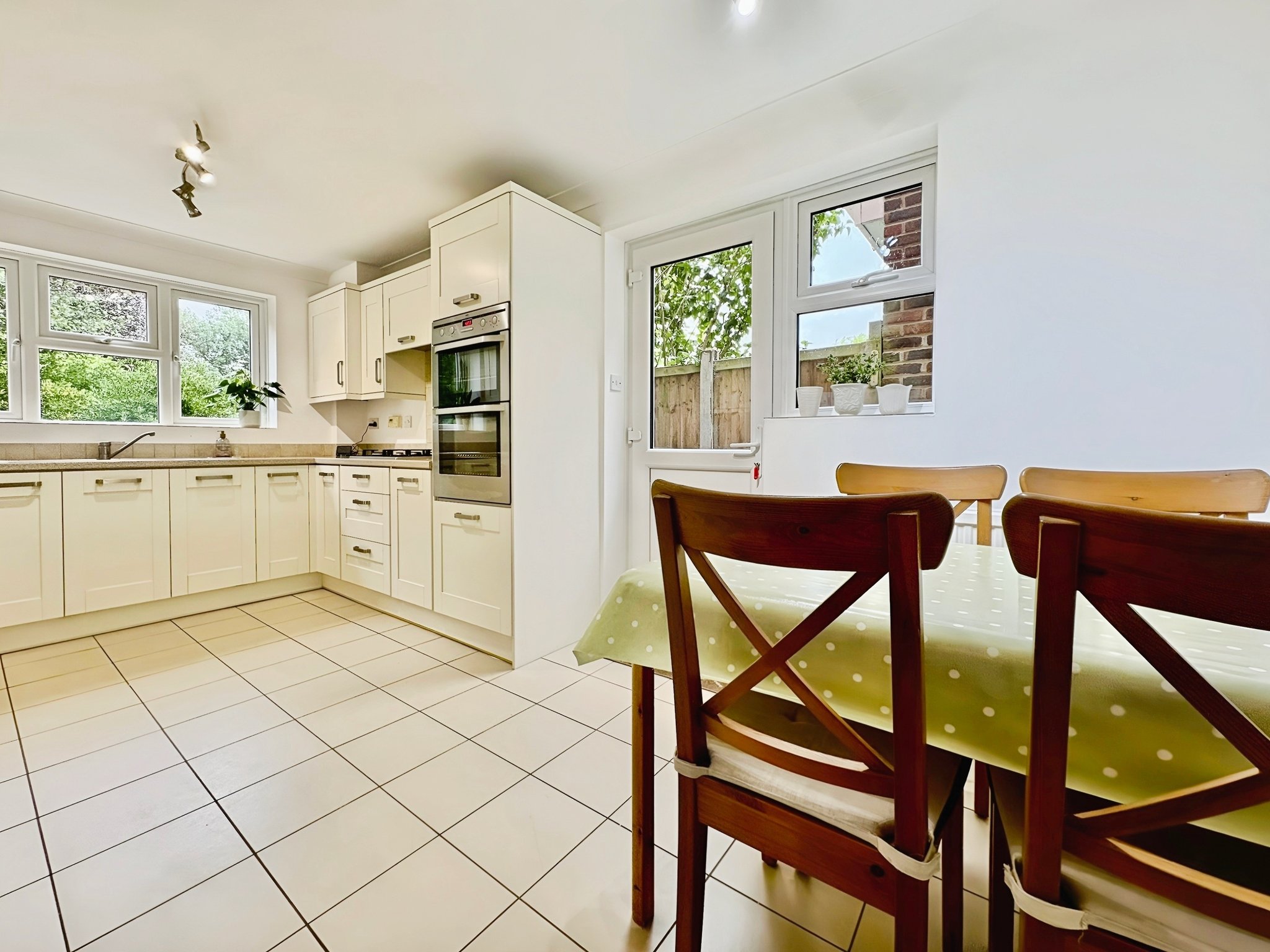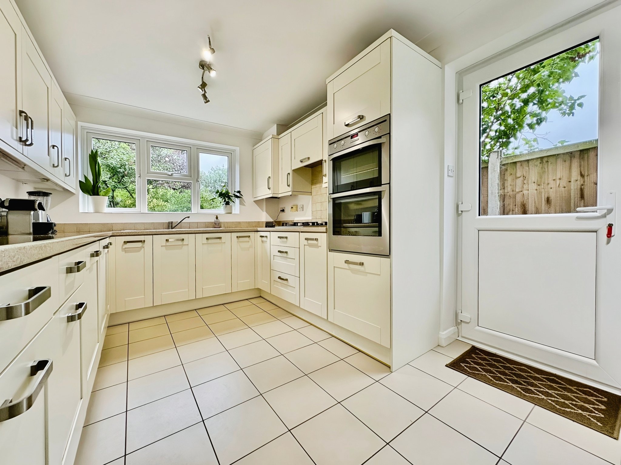 8' 09" x 16' 01" (2.67m x 4.90m) Dual aspect double glazed window to rear and side, door to side, range of wall and base units, rolled edge work surfaces with sink inset, boiler to cupboard, integrated appliances, radiator, part tiled walls.