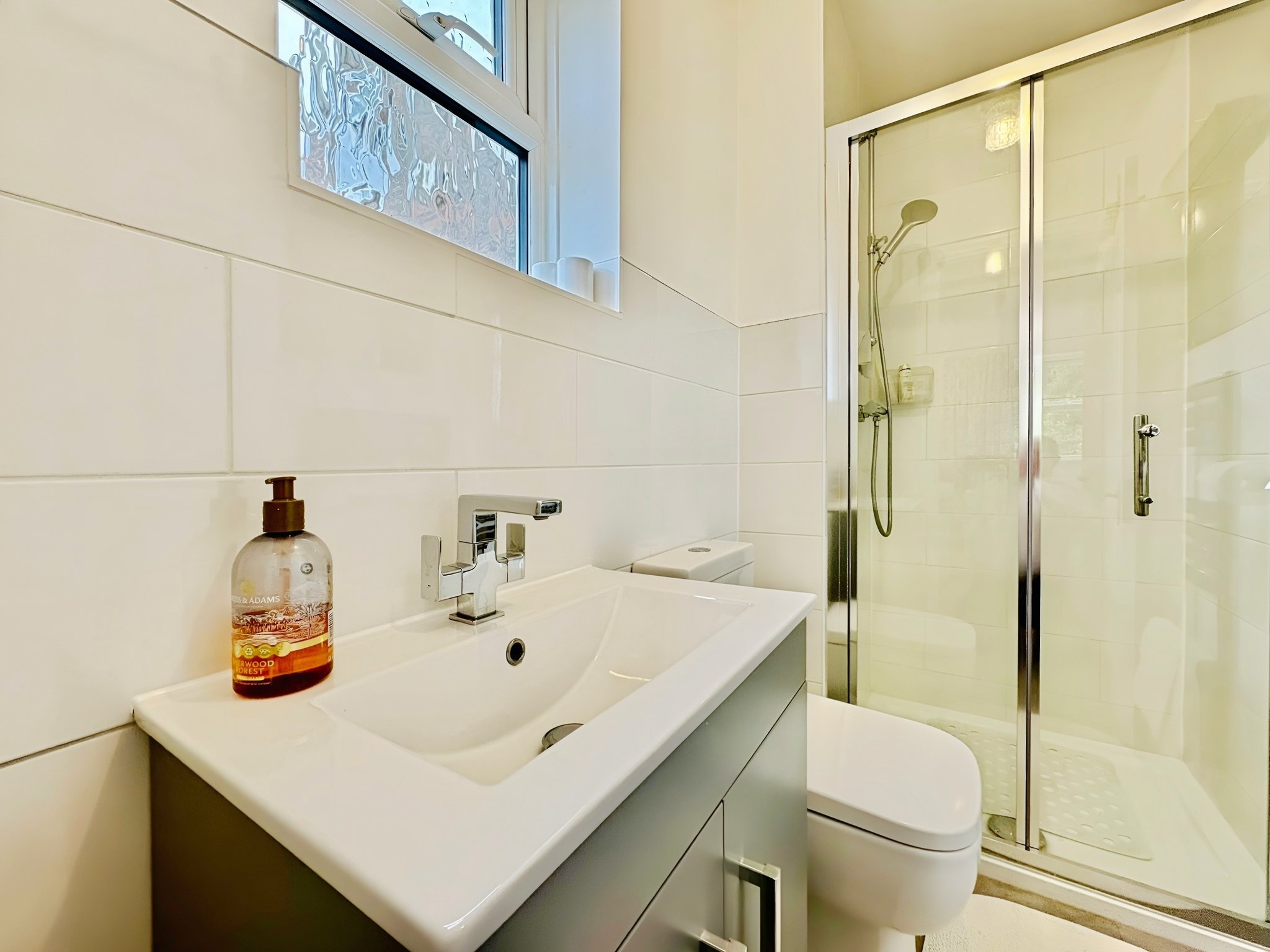 Obscure double glazed, newly fitted window to side, fully tiled shower cubicle, low level W/C, pedestal hand wash basin, heated towel rail, tiled walls.