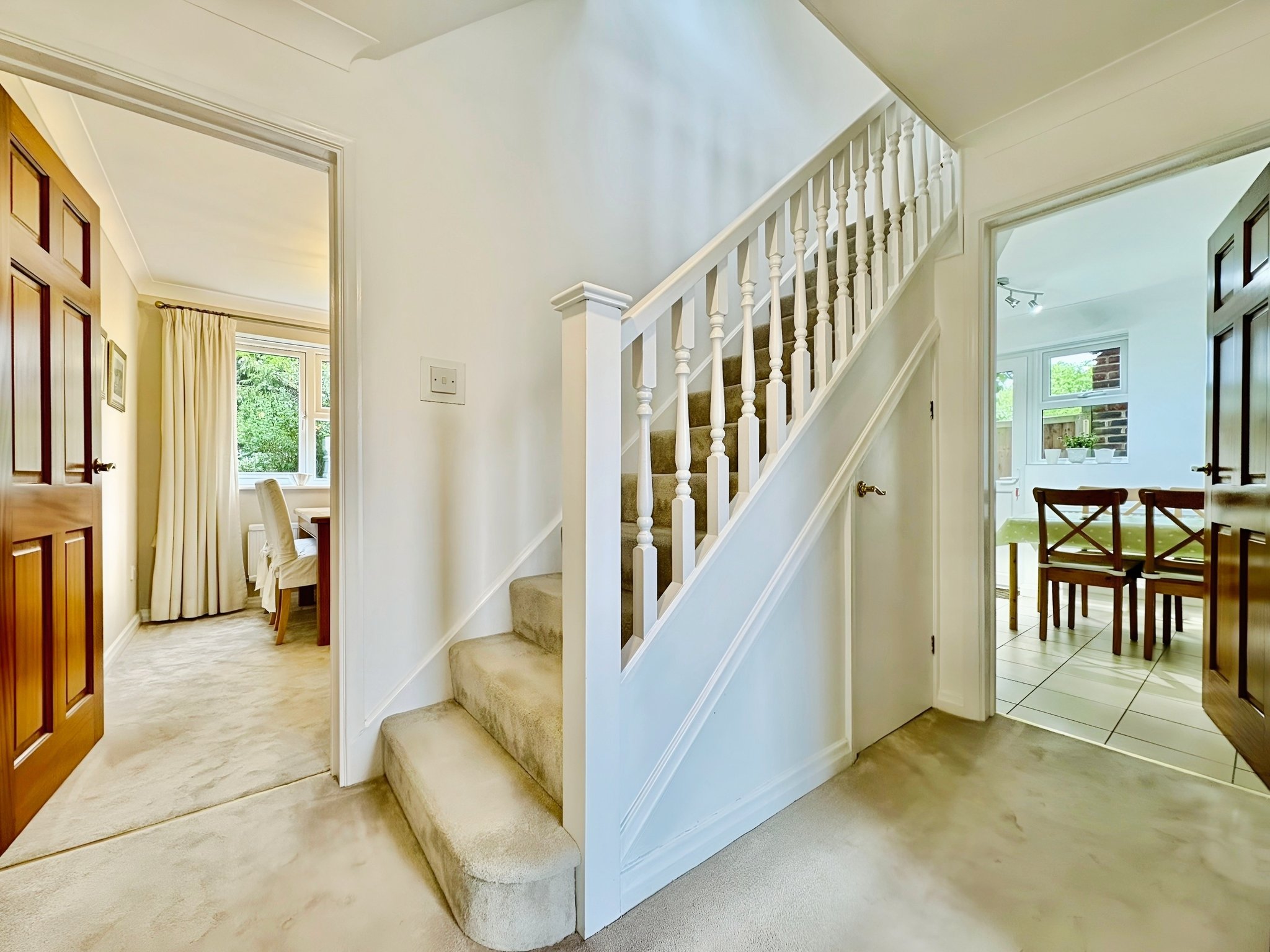 Entrance door to front, doors to cloakroom, kitchen / breakfast room, dining room, lounge, cupboard, stairs to first floor, radiator.