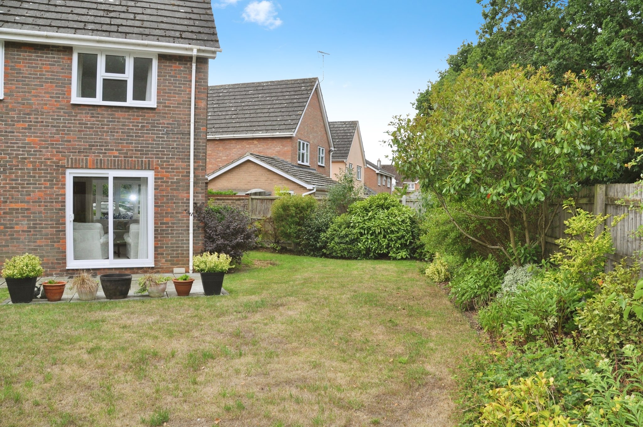 Patio to immediate rear, gated side access, door to garage, mature shrubs to border, rest laid to lawn,