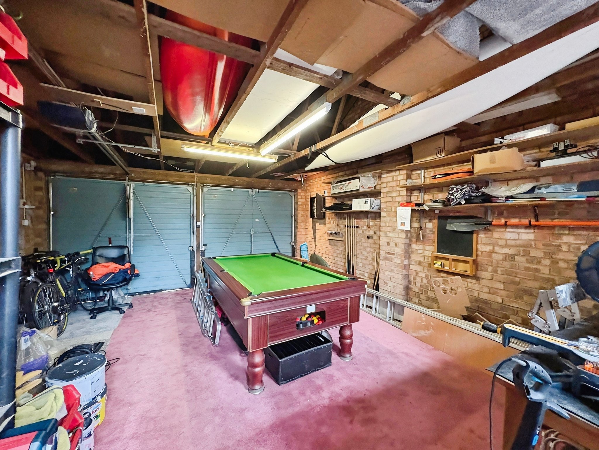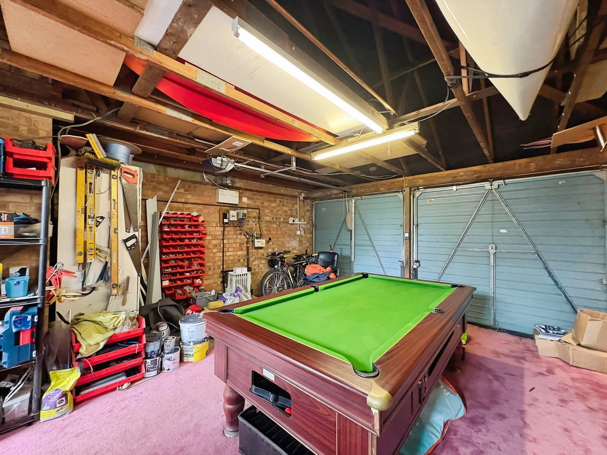 Double garage, twin up and over doors, one side is electric, eaves storage, power and lighting, door to the rear.