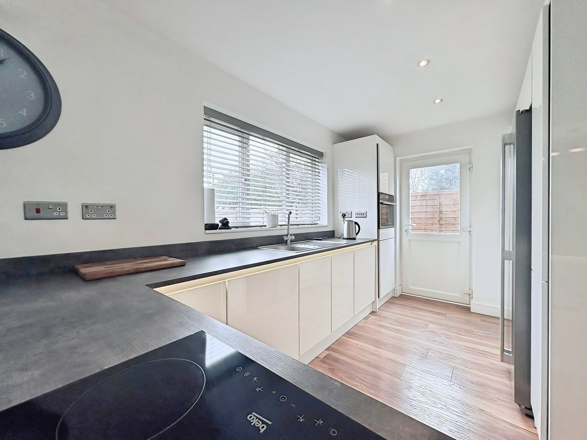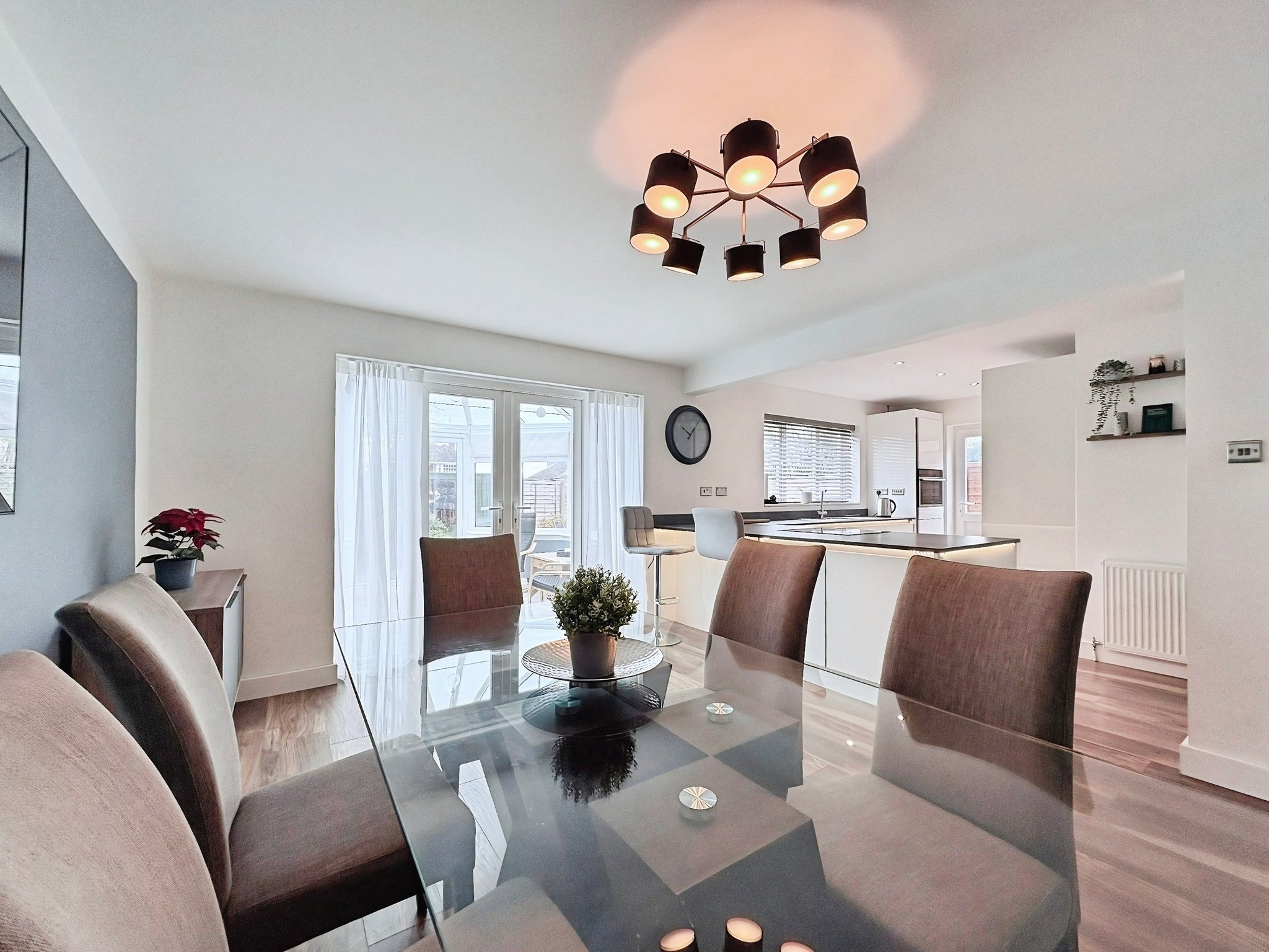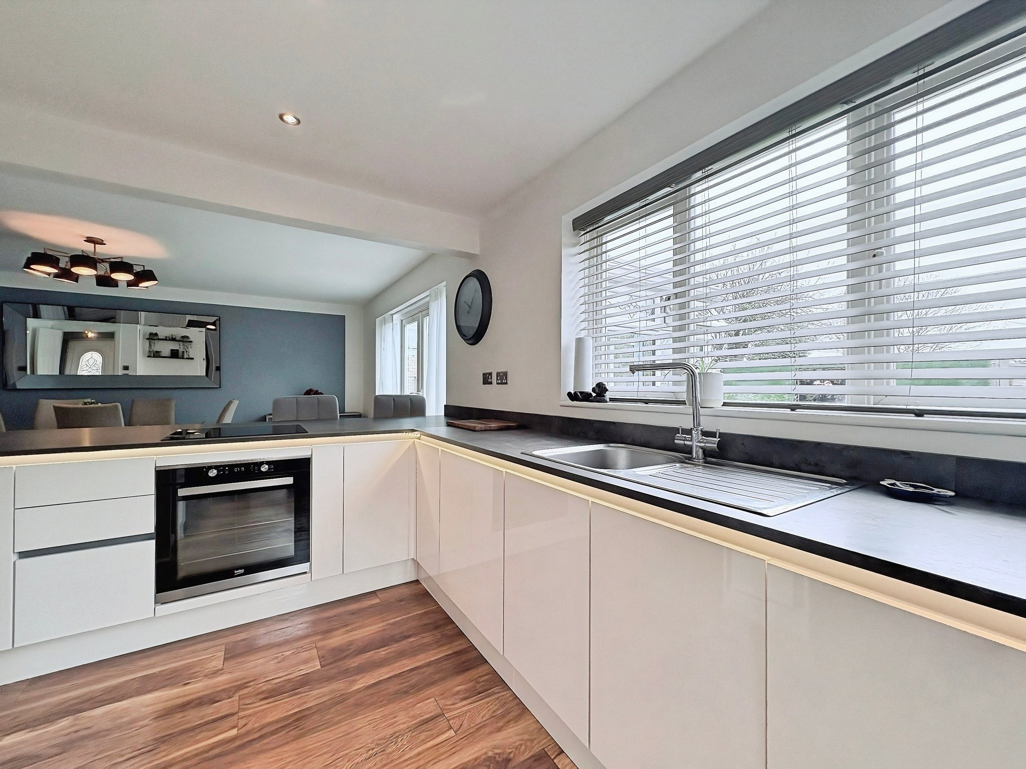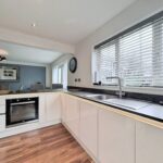 24' 3" x 18' 1" (7.39m x 5.51m) Fitted with a range of base and wall mounted storage cupboards with worktops with fitted under LED lighting, double glazed window to the rear, double glazed door to the side, integrated appliances, space for American style fridge/freezer, stainless steel sink unit, integrated electric oven and hob. Double glazed French doors open onto the conservatory.