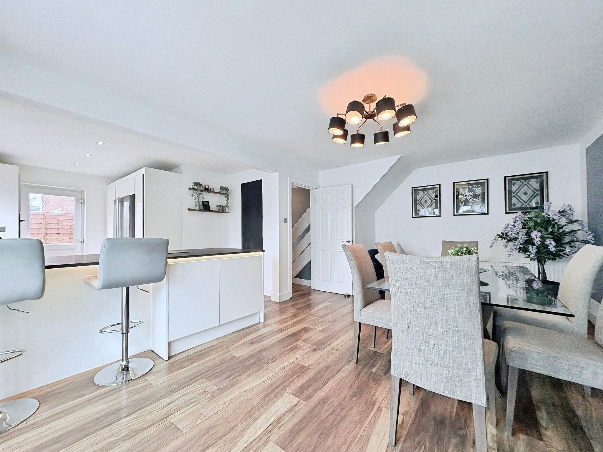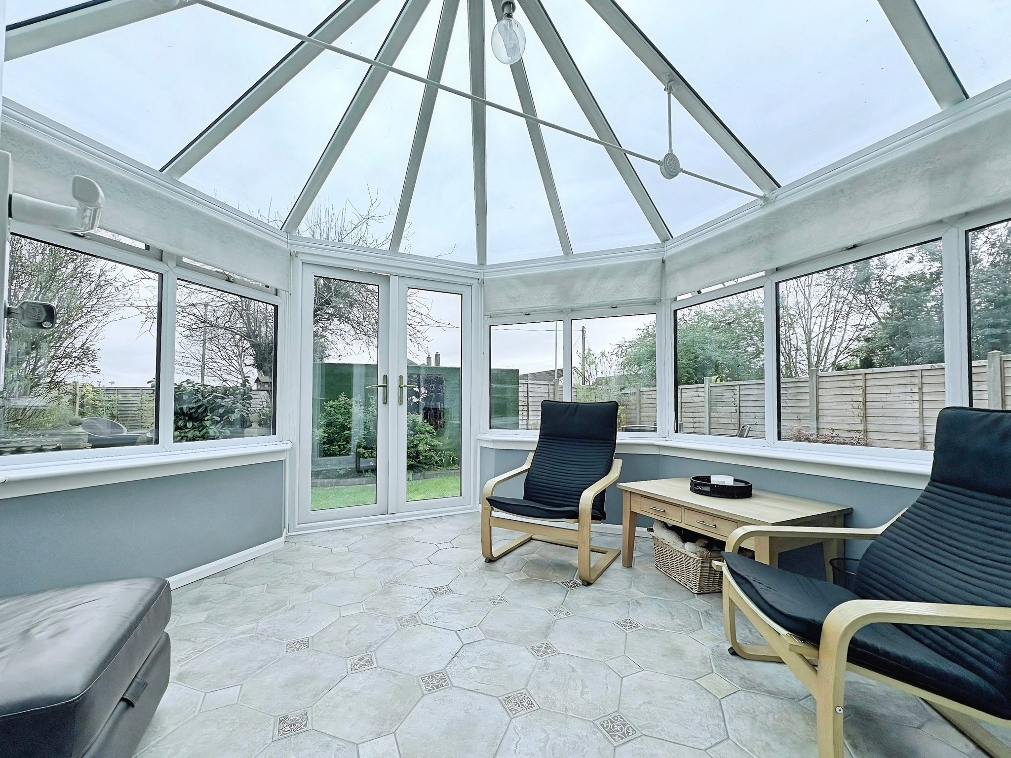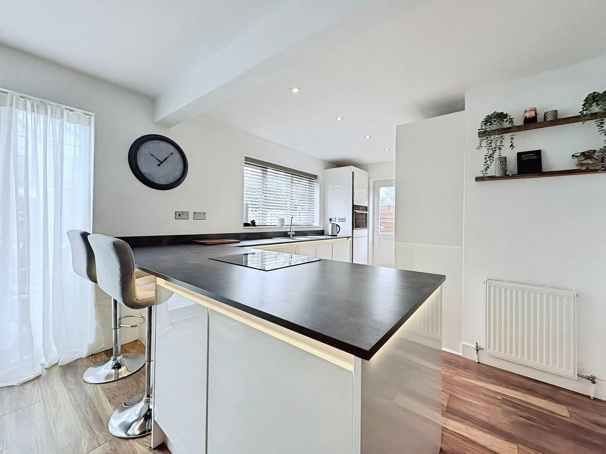 24' 3" x 18' 1" (7.39m x 5.51m) Fitted with a range of base and wall mounted storage cupboards with worktops with fitted under LED lighting, double glazed window to the rear, double glazed door to the side, integrated appliances, space for American style fridge/freezer, stainless steel sink unit, integrated electric oven and hob. Double glazed French doors open onto the conservatory.
