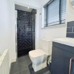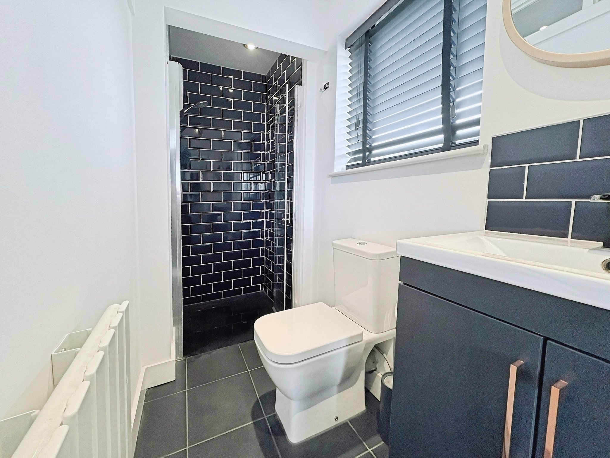 Double glazed obscure window to flank, walk in shower, wash hand basin, w/c, heated towel rail.