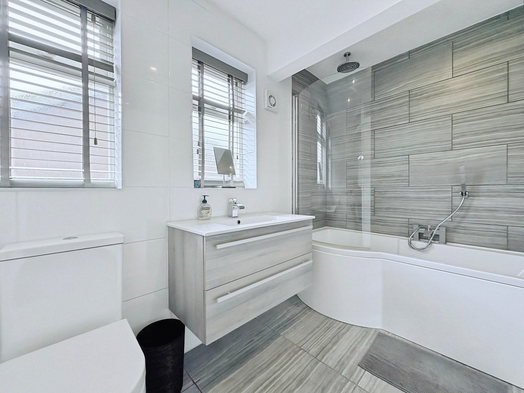 Double glazed obscure windows to rear, panel bath with rainfall shower over and hand attachment, and glass screen, wash hand basin with vanity unit below, wc, heated towel rail.