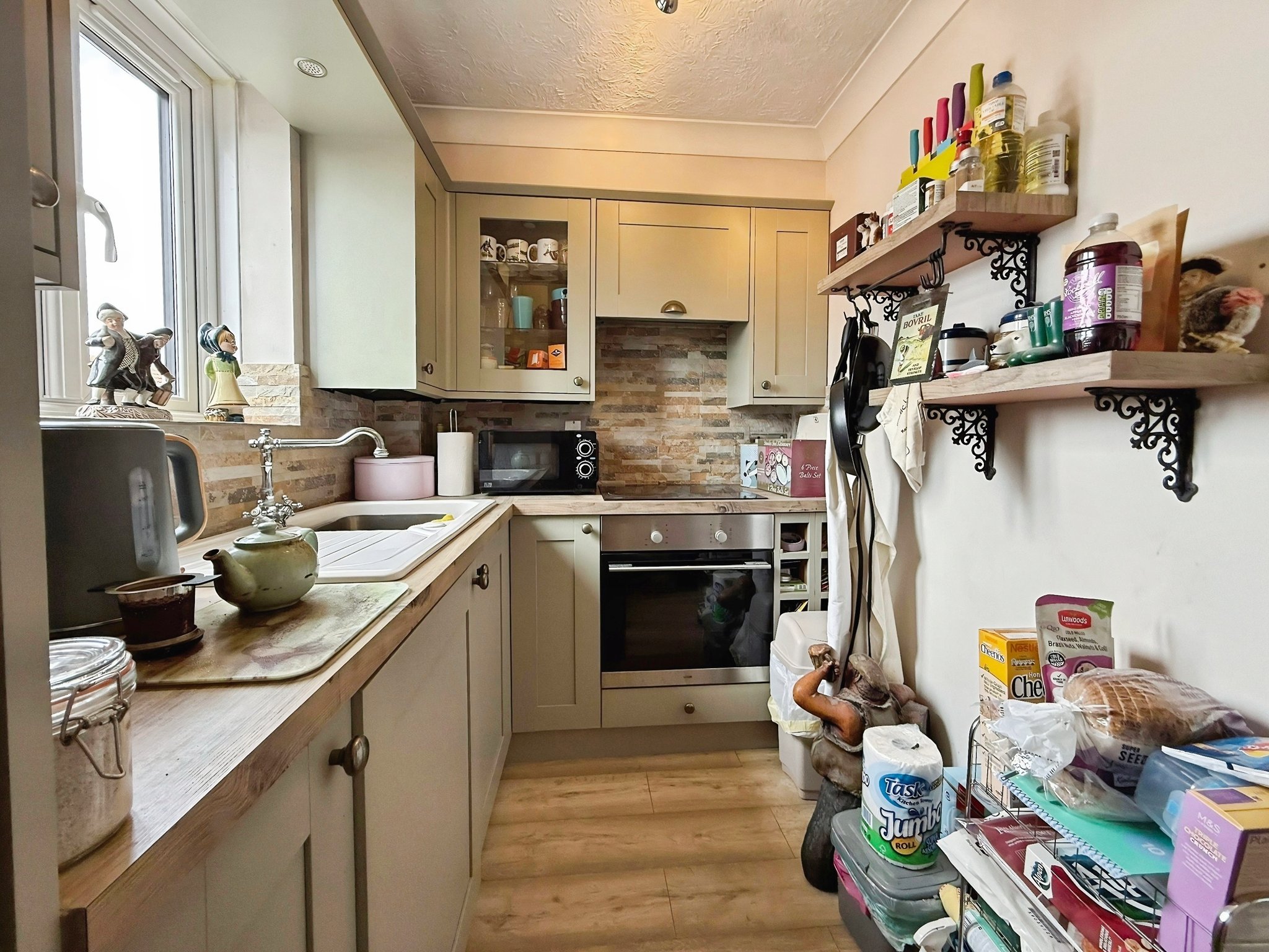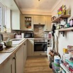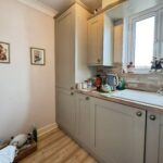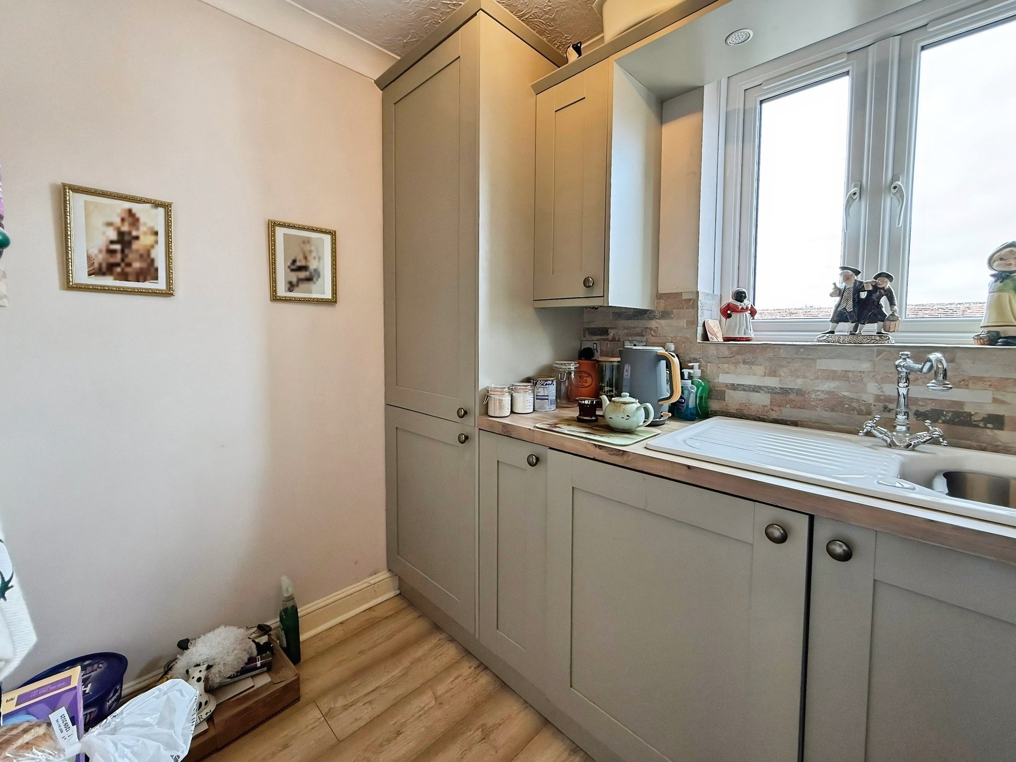 Fitted with a range of base and wall mounted storage cupboards, integrated fridge/freezer, integrated washing machine, integrated electric oven and hob with extractor over, ceramic sink unit.