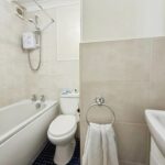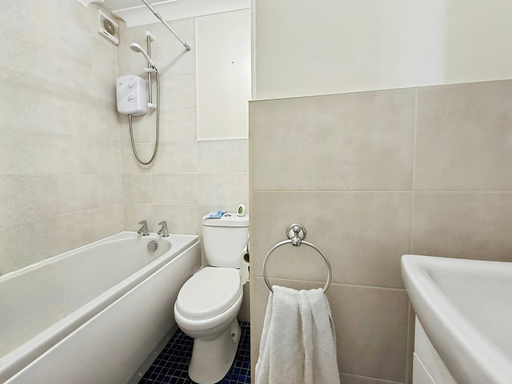Vanity wash hand basin, panelled bath with shower over, low level wc, airing cupboard,