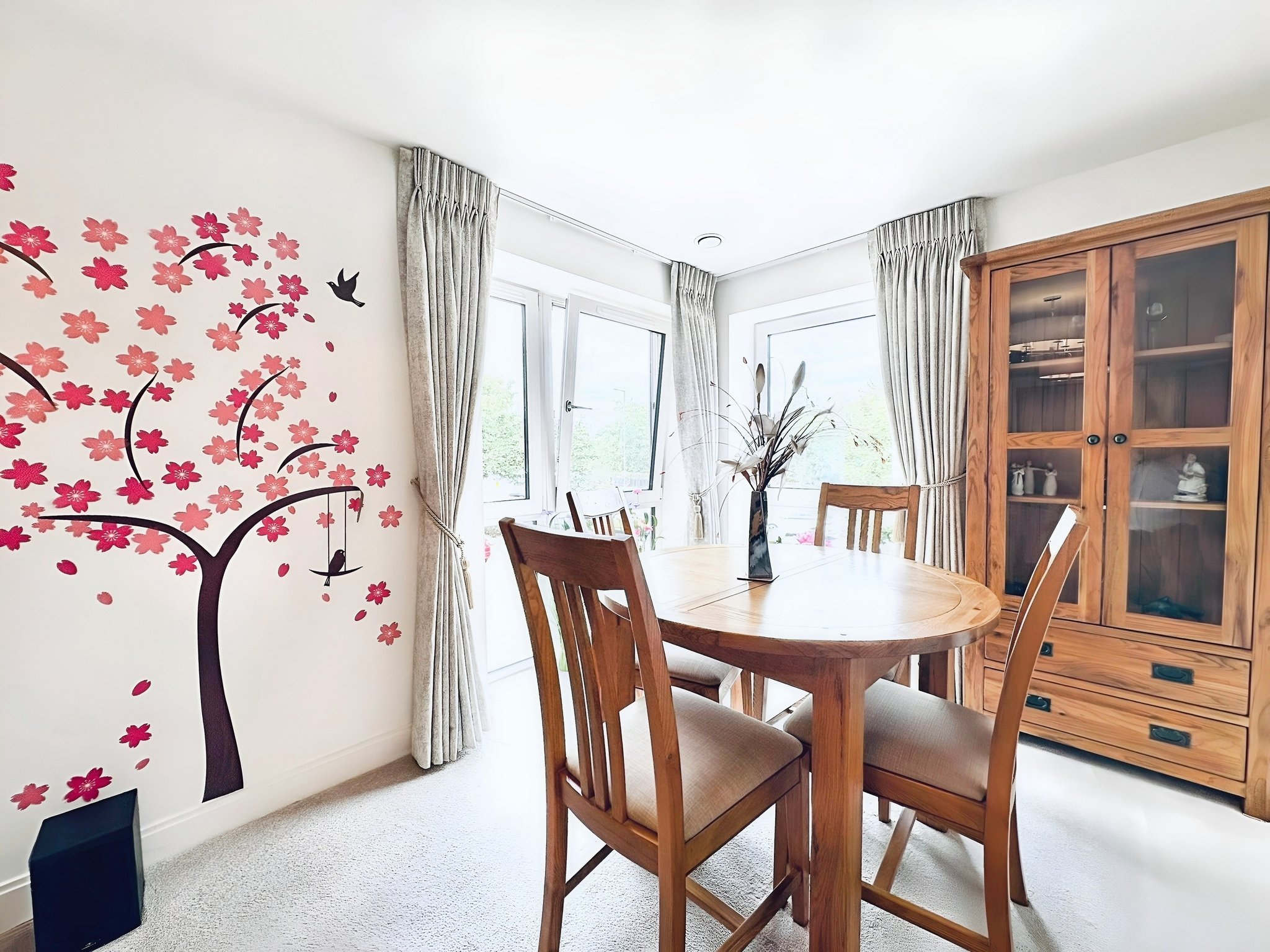 Electric feature fireplace, storage cupboard, window to front and side, door to kitchen
