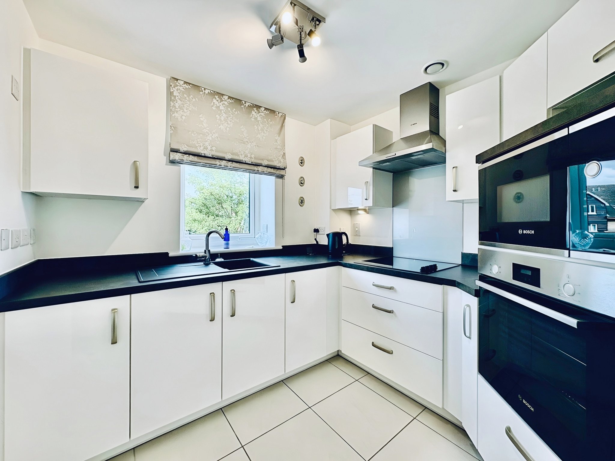 Fitted with a range of base and wall mounted storage cupboards, window to front, integrated fridge/freezer, integrated electric oven and microwave, integrated electric hob with extractor over, sink unit.