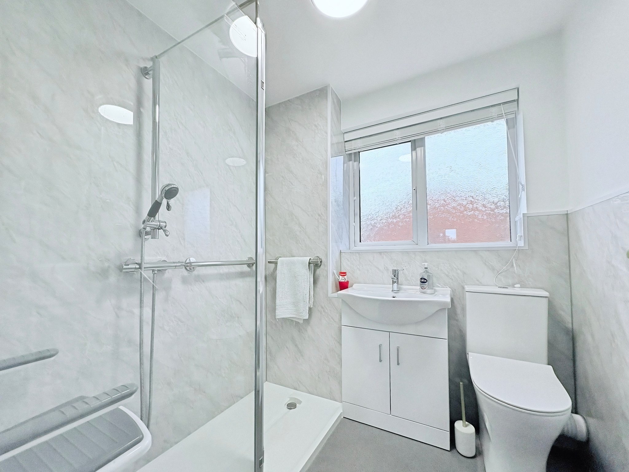 Double glazed obscure window to the rear, recently re fitted with a large walk in shower, wash hand basin with vanity unit below, w/c, heated towel rail.