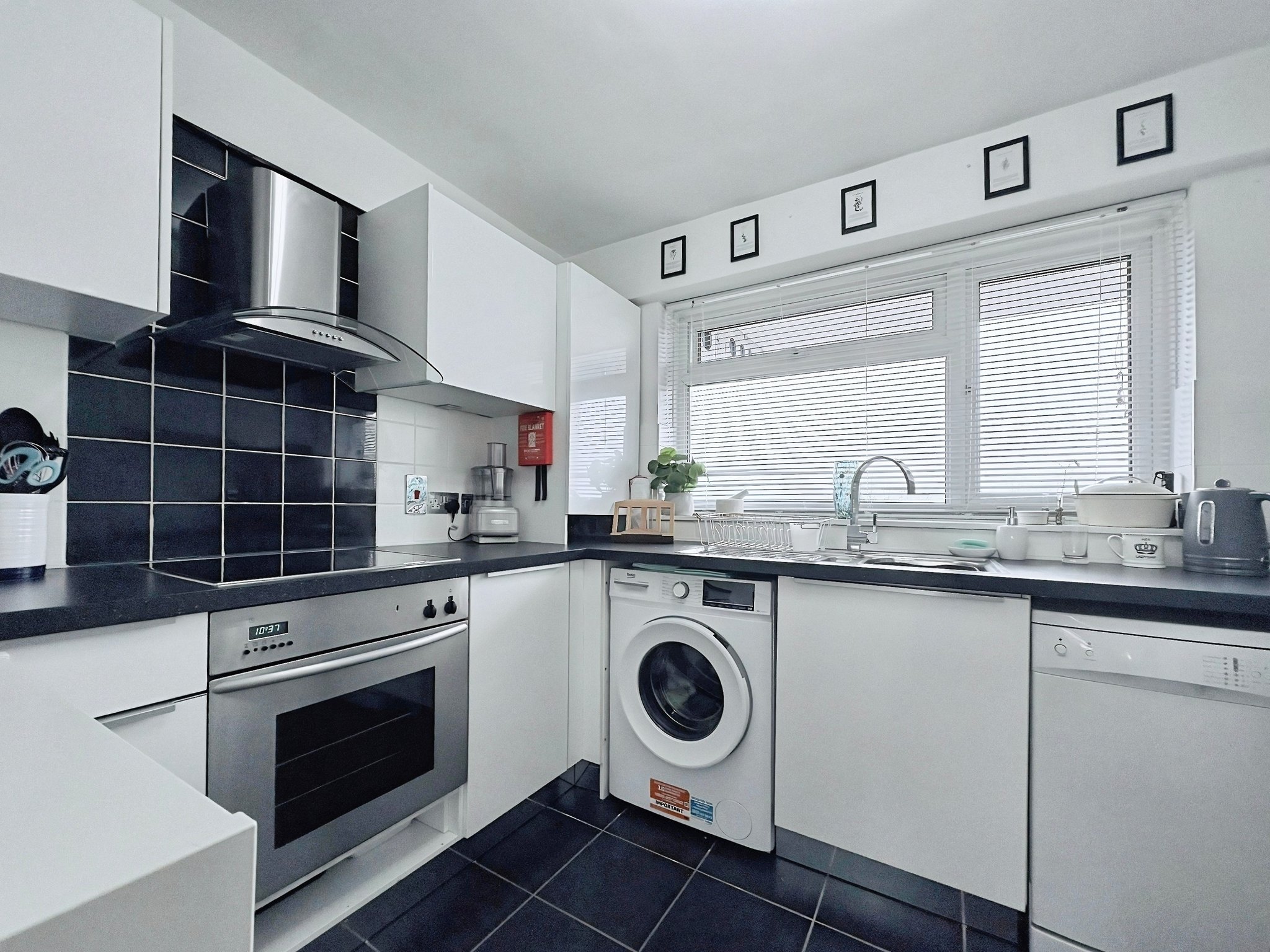 7' 07" x 9' 07" (2.31m x 2.92m) Double glazed window to front, fitted with a range of matching eye and base level units,, integrated electric oven, hob and extractor over, washing machine and fridge freezer and dishwasher, stainless steel single drainer sink unit with mixer taps, tiled splashbacks.