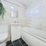 Double glazed obscure window to the front, recently re fitted bathroom suite, white panel bath with shower over and glass screen, sink with vanity unit below, low level w/c, heated towel rail, tiled walls and floor.