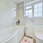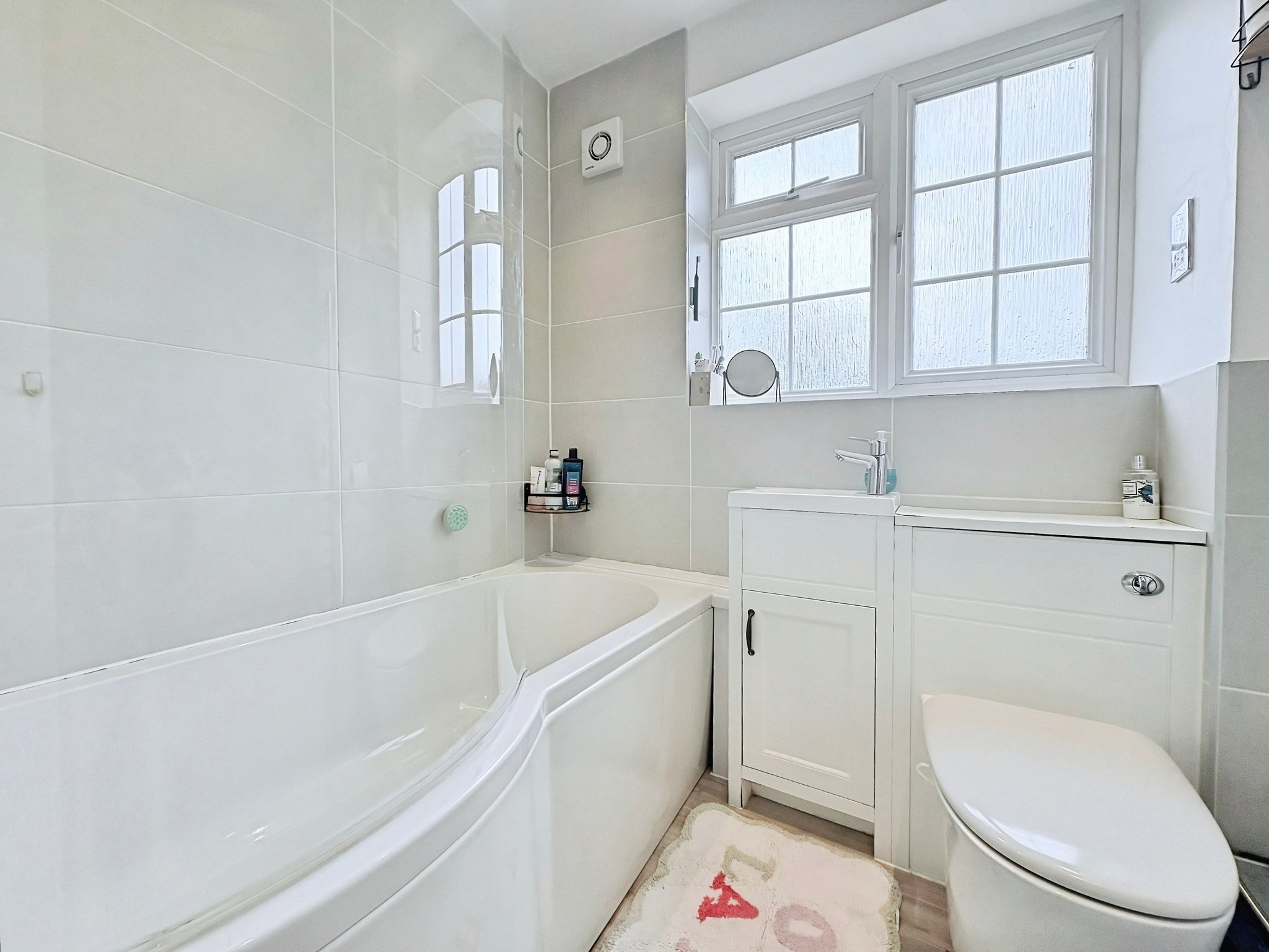 Heated towel rail, low level wc, wash hand basin, obscure double glazed window to rear, panelled bath with shower over.