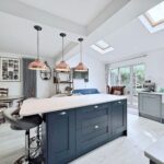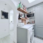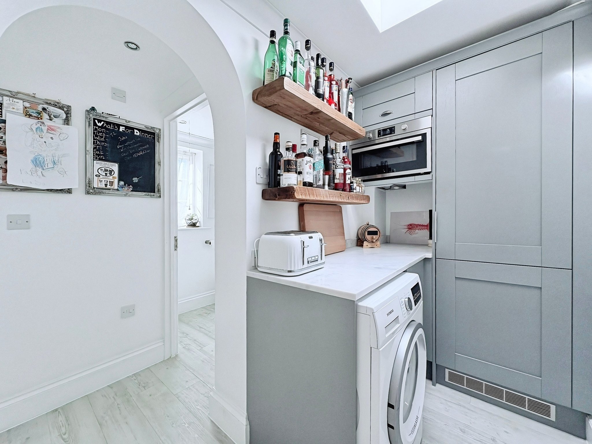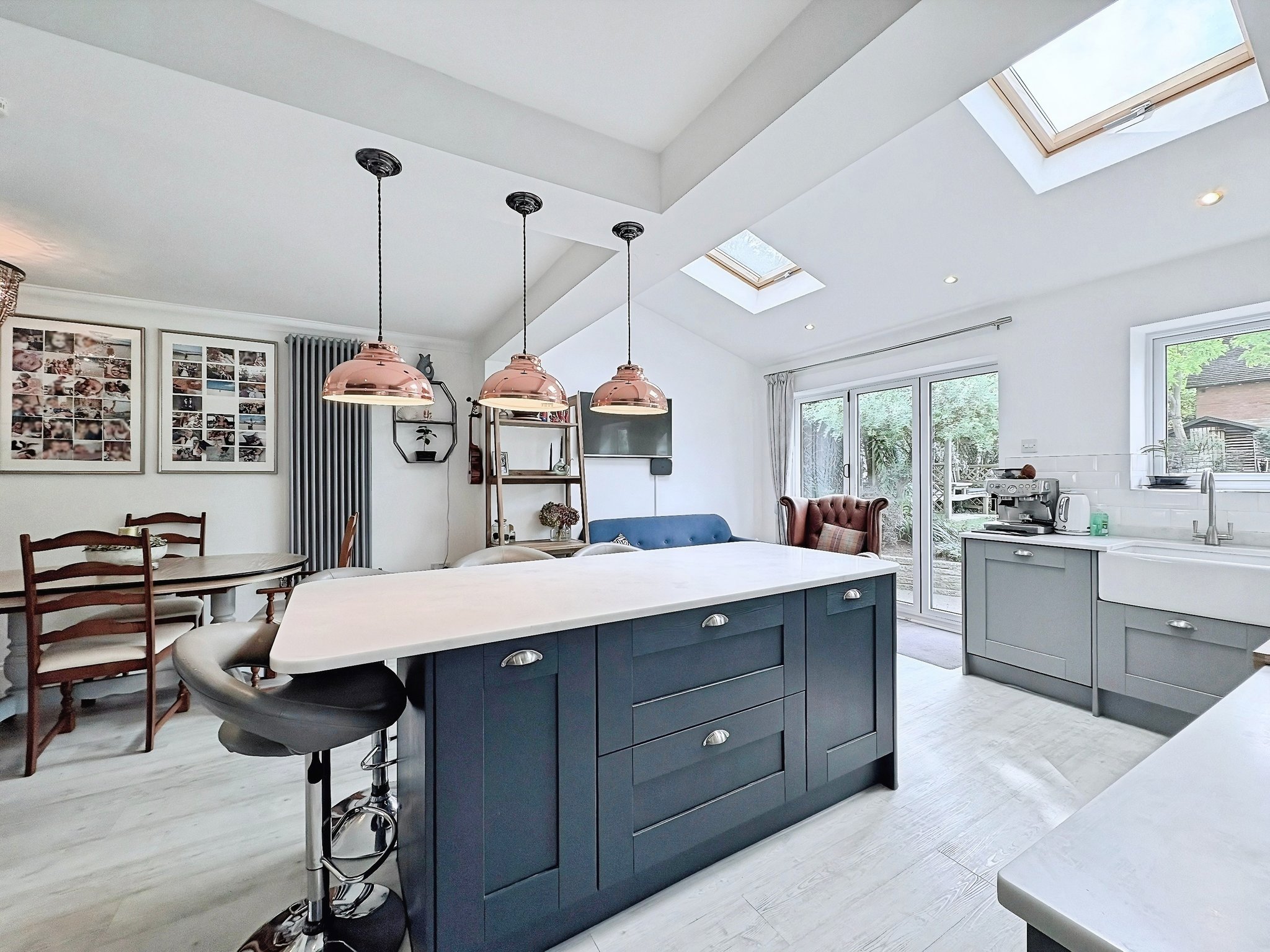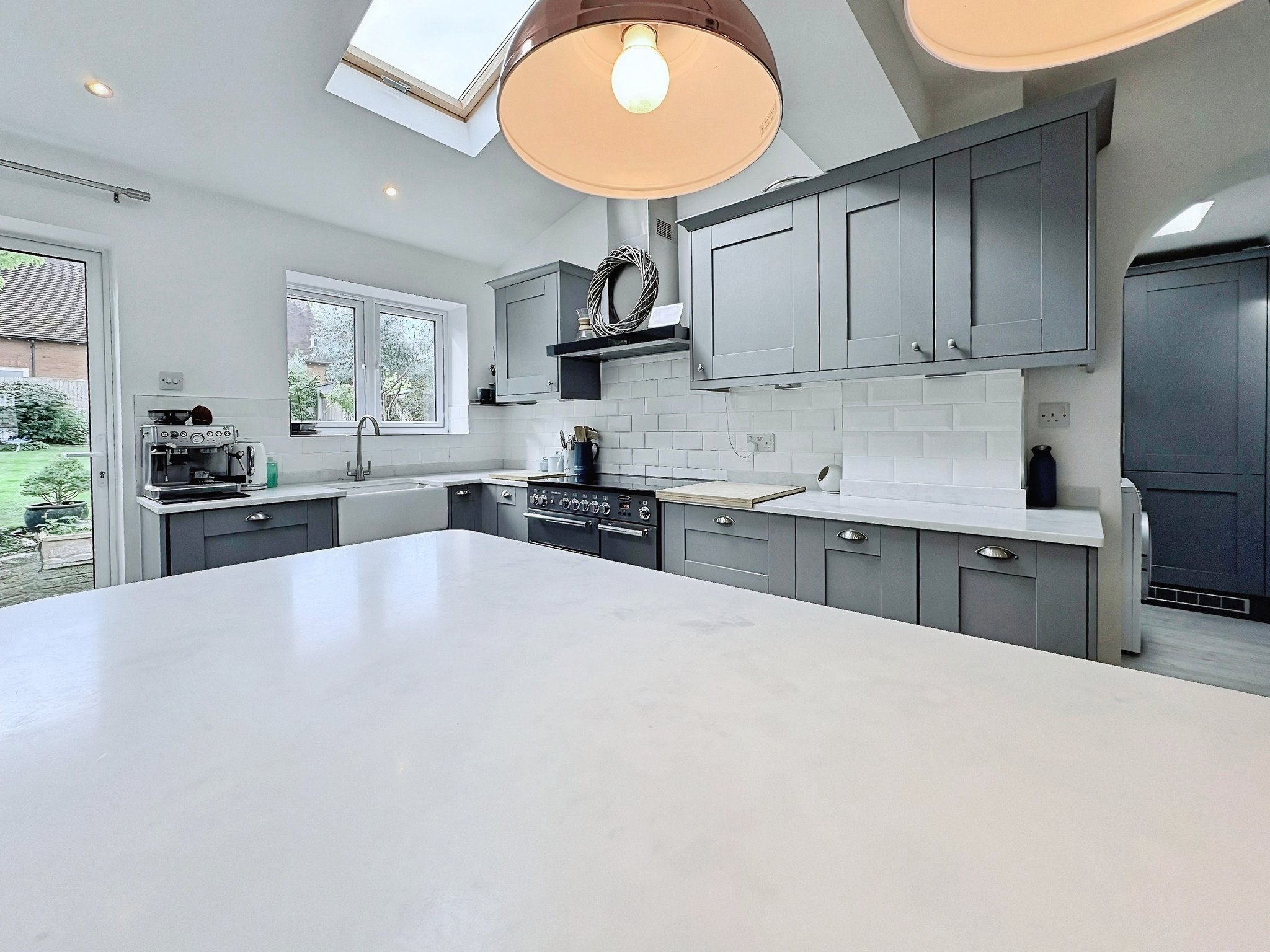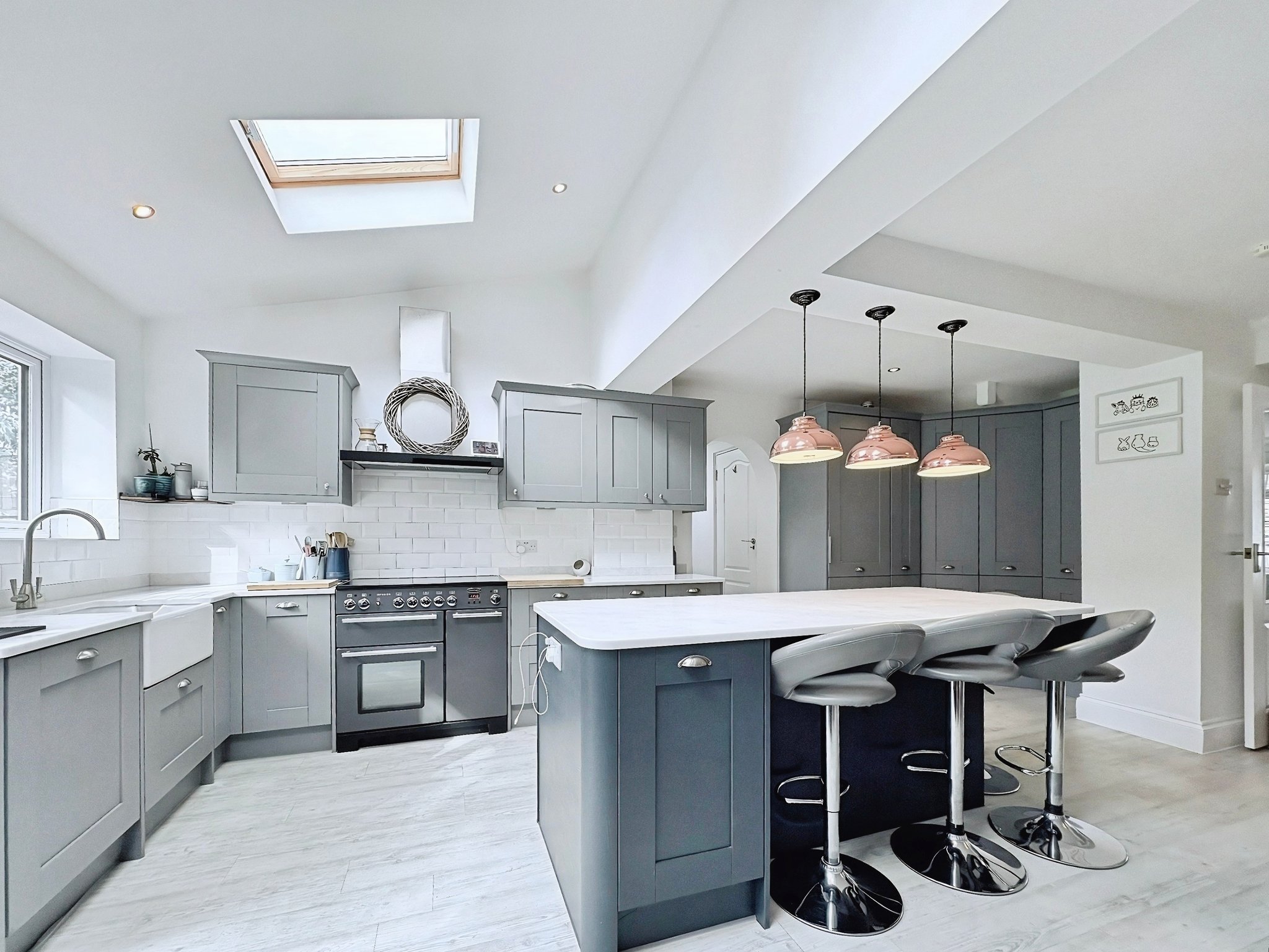 Fitted with a range of base and wall mounted storage cupboards, bi-fold doors to rear garden, double glazed window to rear, velux windows to rear, butler sink, space for cooker, door to utility room.